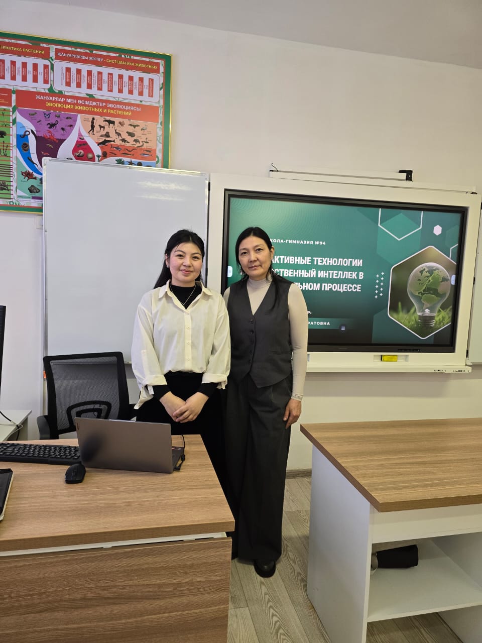«943-ел мектептерін дамыту» жобасы аясында мақсатты мектептерде тәлімгерлік жұмыс жоспары бойынша 2025 жылдың 26 ақпанында мектебімізде №94 мектеп-гимназиясының биология пәні мұғалімі Темирова Ажар Маратқызы «Оқу процесінде интерактивті технологиялар мен жасанды интеллектті қолдану» тақырыбында тренинг өткізді. Бұл серіктестіктің мақсаты – педагогикалық кадрлармен жұмыс жүйесін жетілдіру, өз іс-әрекеттерін бағалау және кәсіби құзыреттілікті арттыру болып табылады.