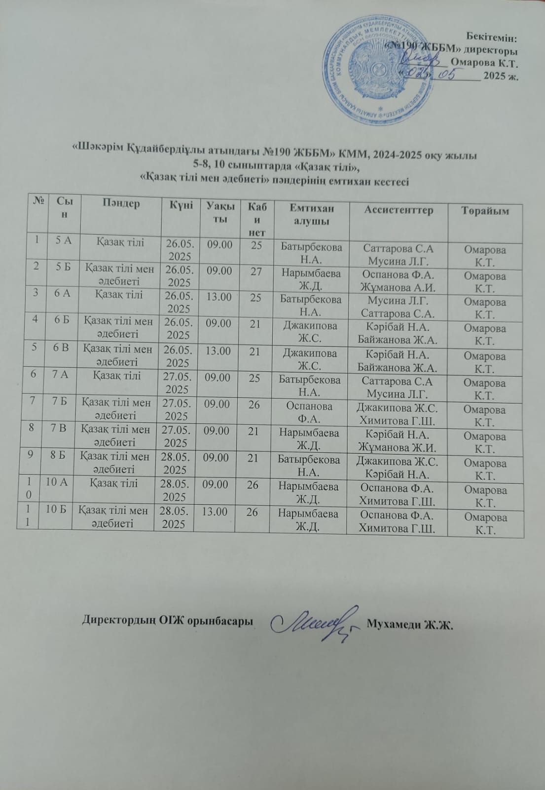 Қазақ тілі пәнінен емтихан кестесі 2025 жыл (5-8,10 сыныптар)