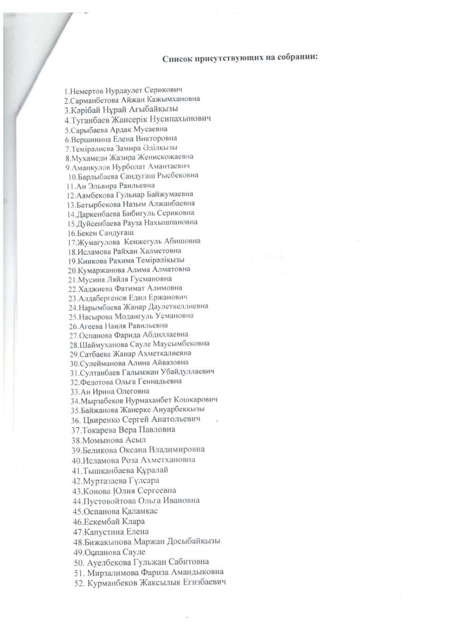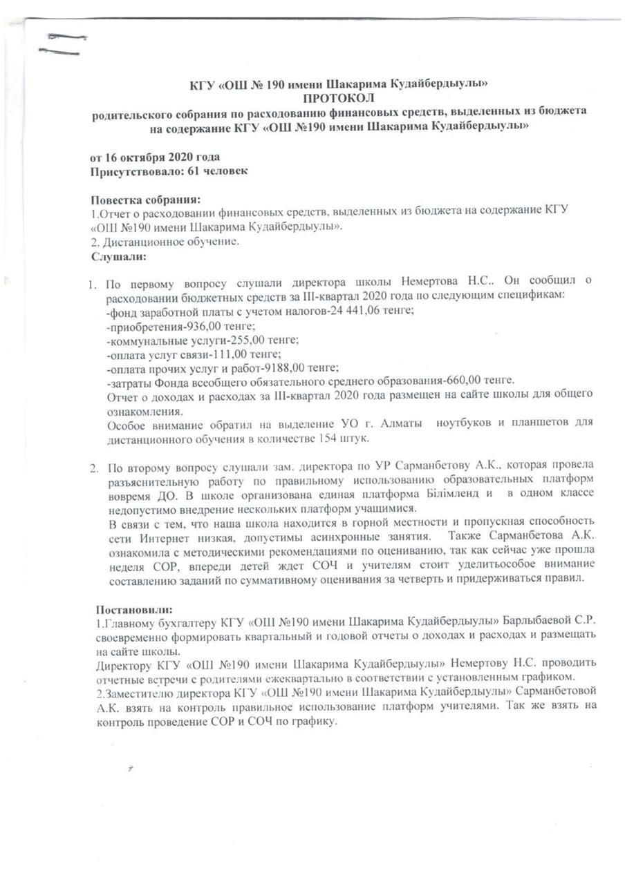 » Ата-аналар жиналысының 2020 жылғы 16 қазандағы ХАТТАМАСЫ