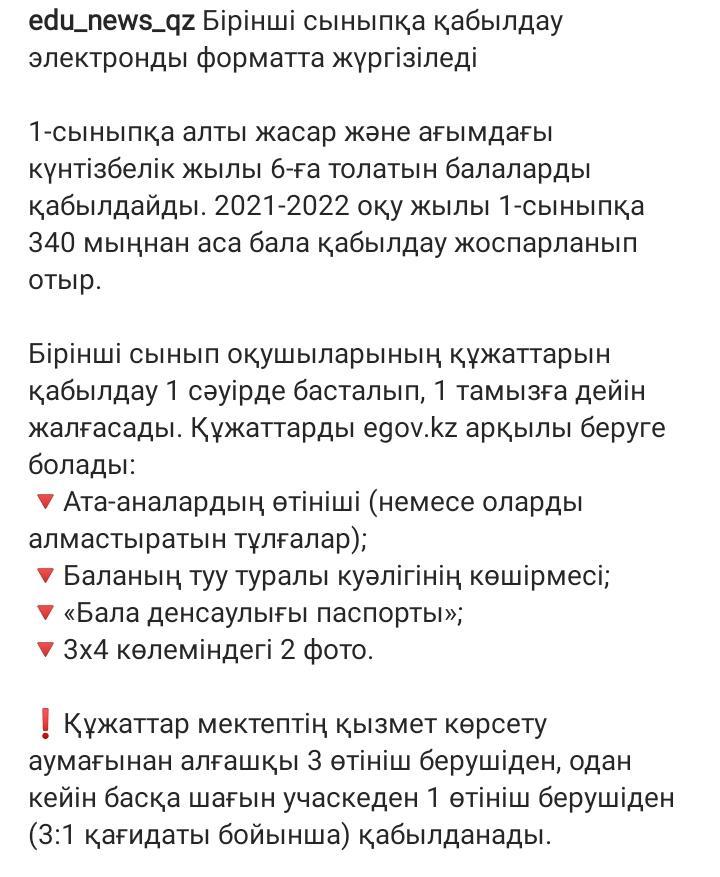 » Бірінші сыныпқа қабылдау электронды формматта жүргізіледі