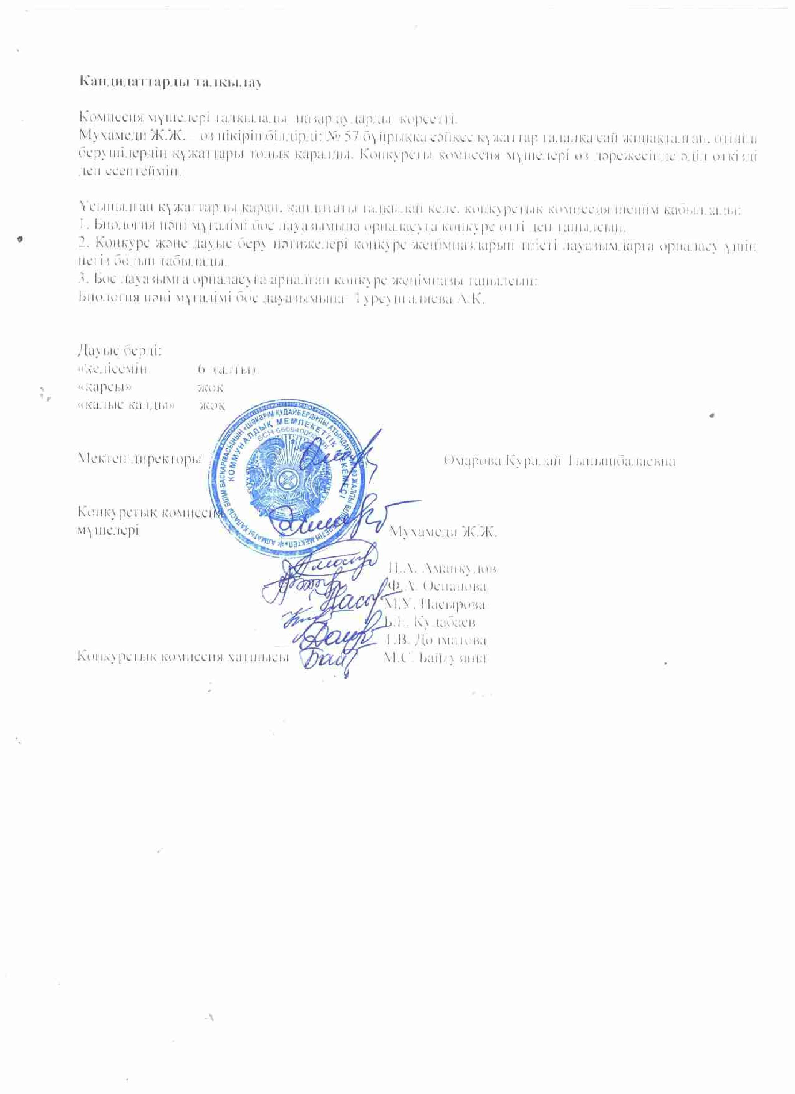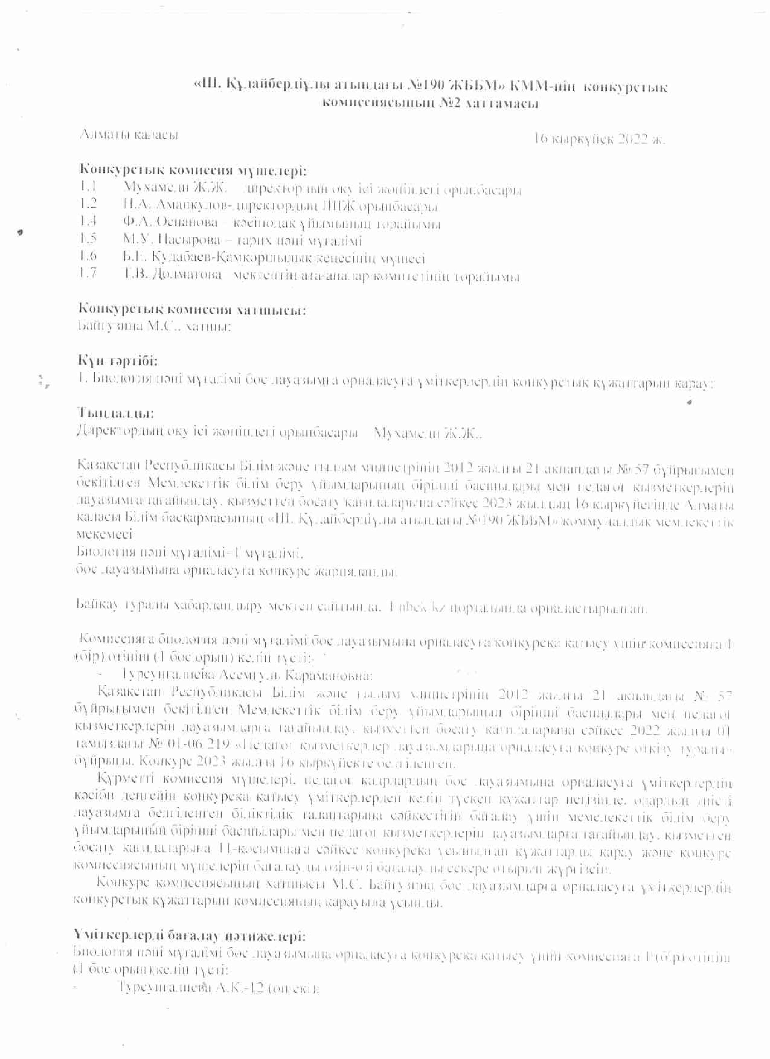16 қыркүйек 2022 0 1 2 3 4 5 Ш.Құдайбердіұлы атындағы №190 ЖББМ КММ-нің конкурстық комиссиясының №2 хаттамасы