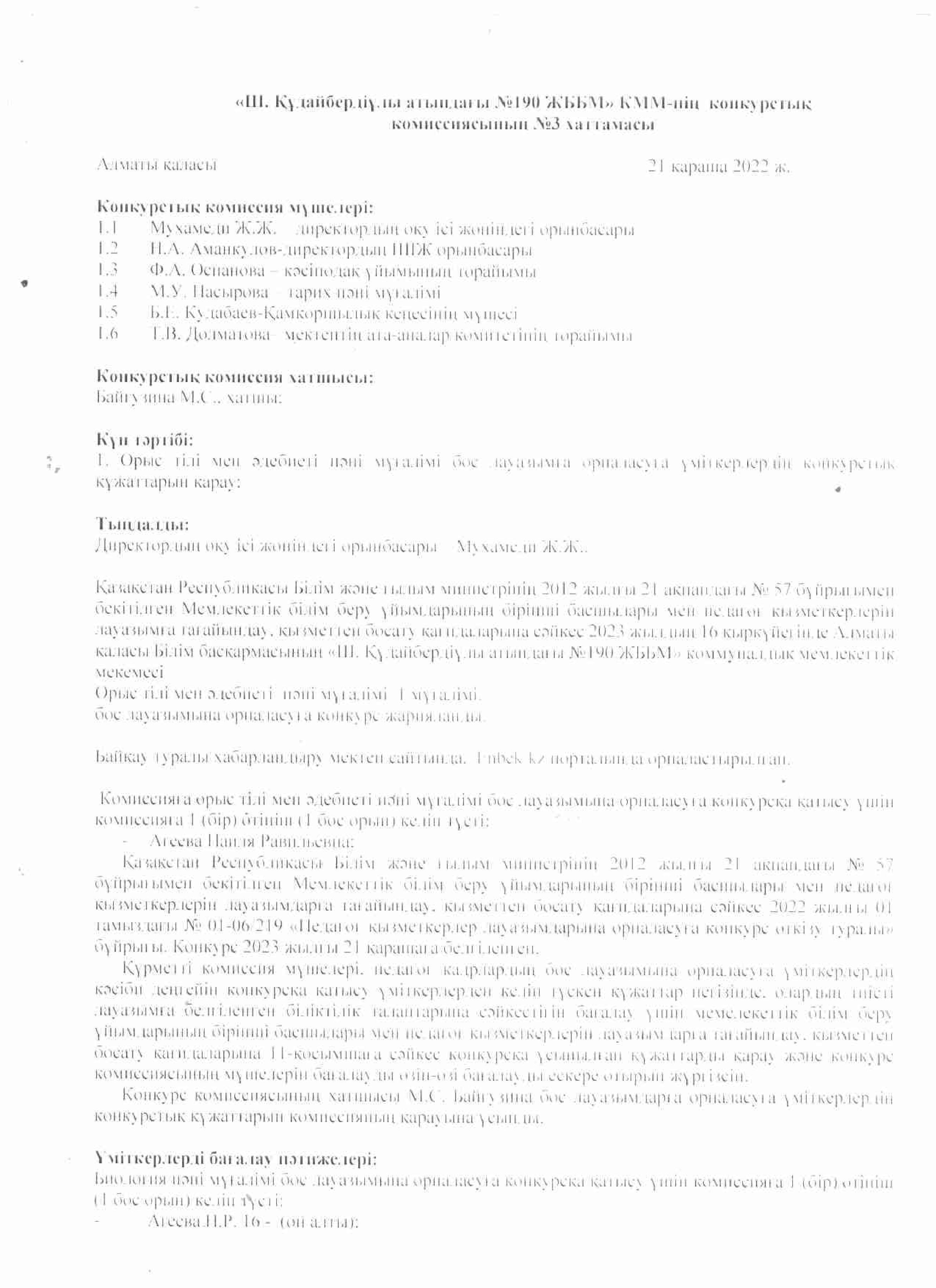 21 қараша 2022 0 1 2 3 4 5 Ш.Құдайбердіұлы атындағы №190 ЖББМ КММ-нің конкурстық комиссиясының №3 хаттамасы
