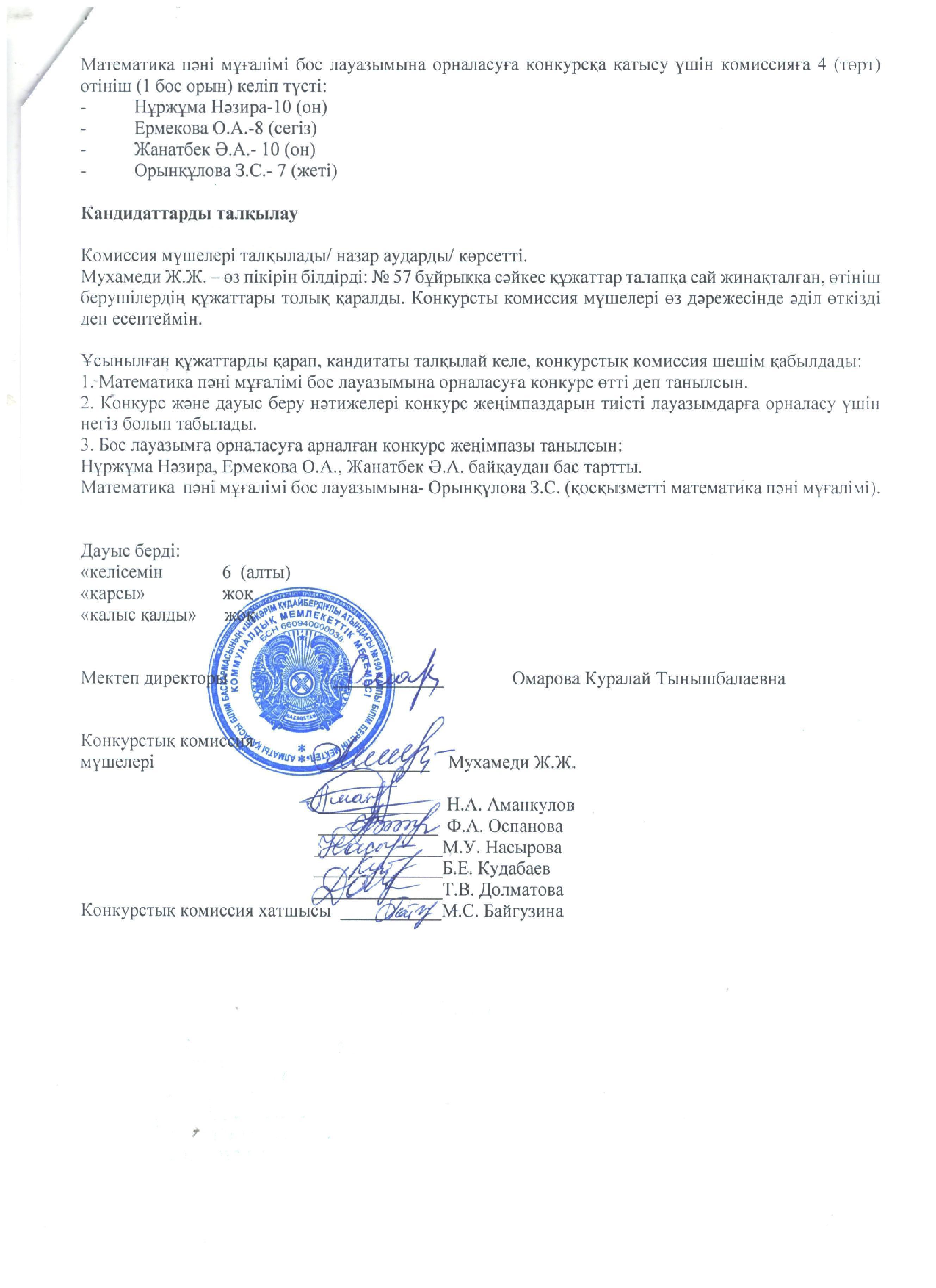 Ш.Құдайбердіұлы атындағы №190 ЖББМ КММ-нің конкурстық комиссиясының №2 хаттамасы