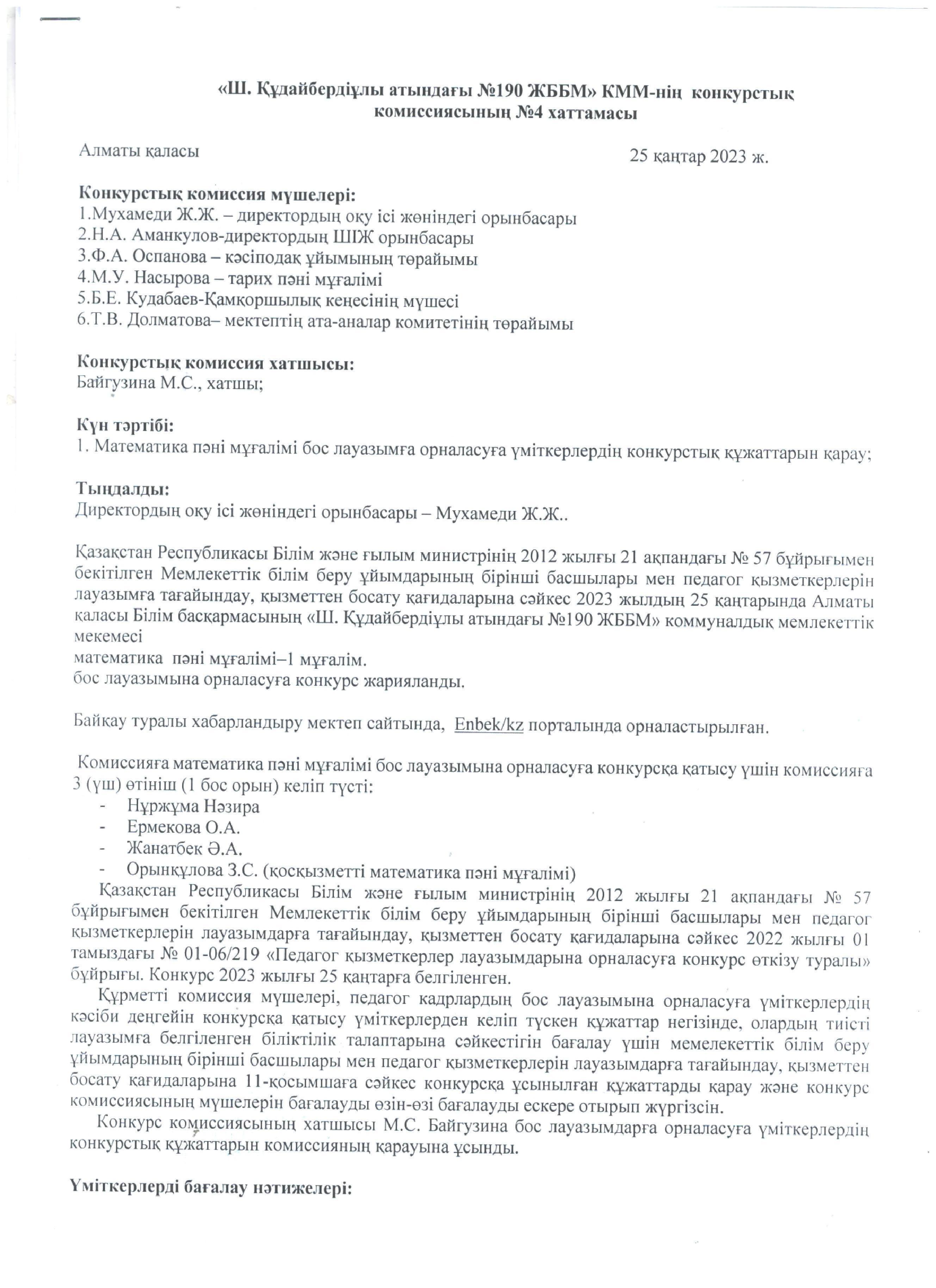 Ш.Құдайбердіұлы атындағы №190 ЖББМ КММ-нің конкурстық комиссиясының №1 хаттамасы