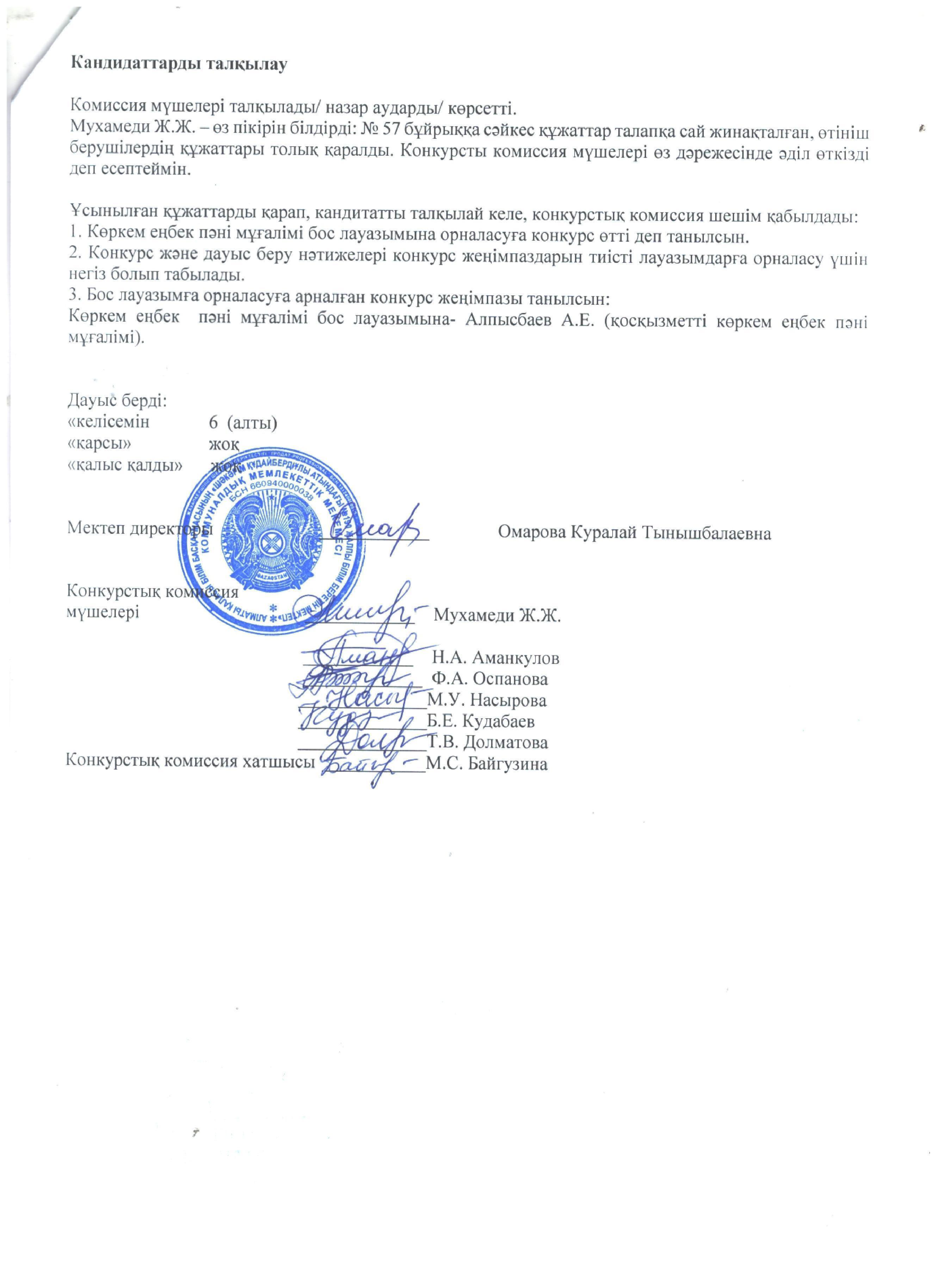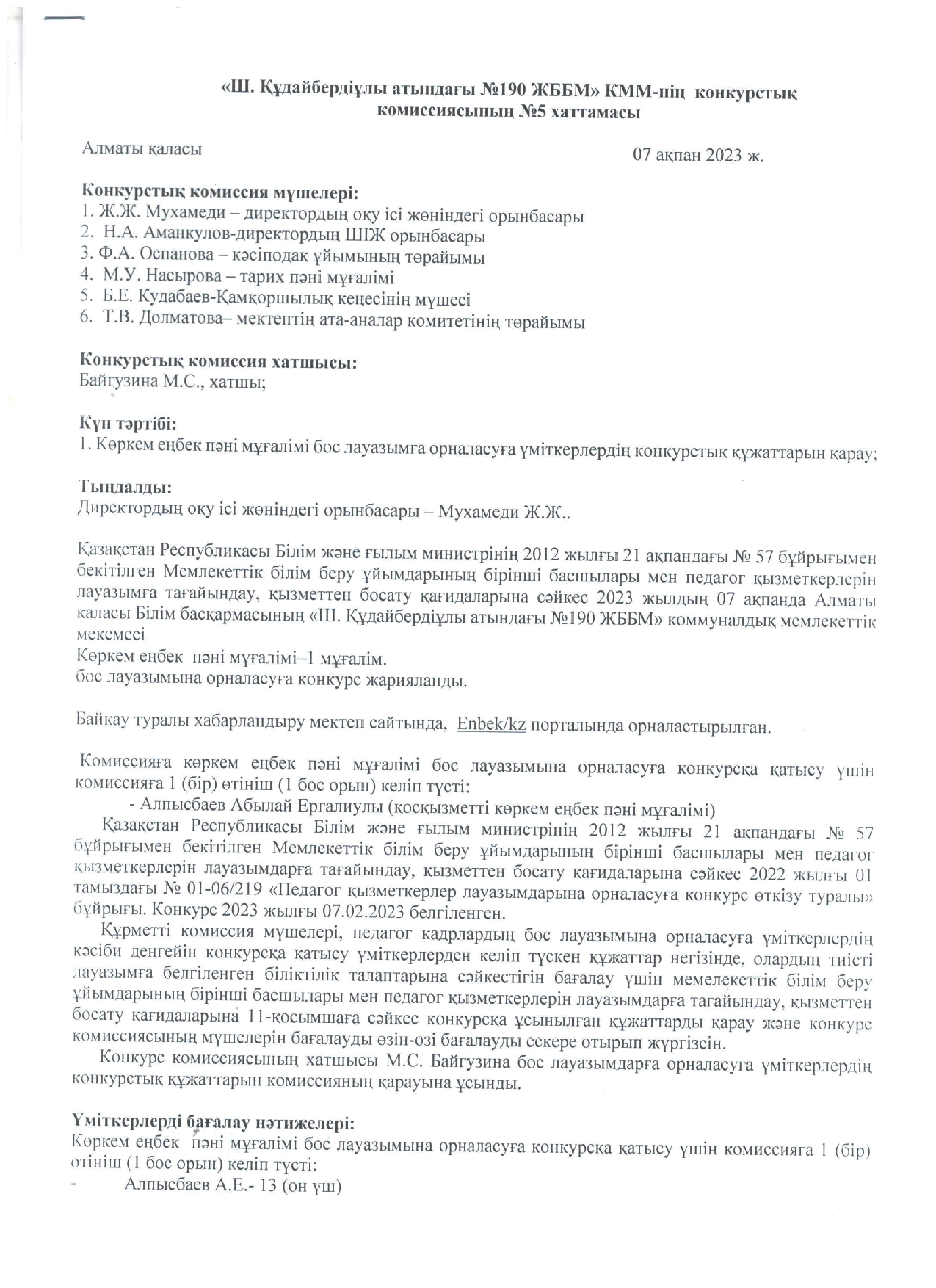 Ш.Құдайбердіұлы атындағы №190 ЖББМ КММ-нің конкурстық комиссиясының №1 хаттамасы