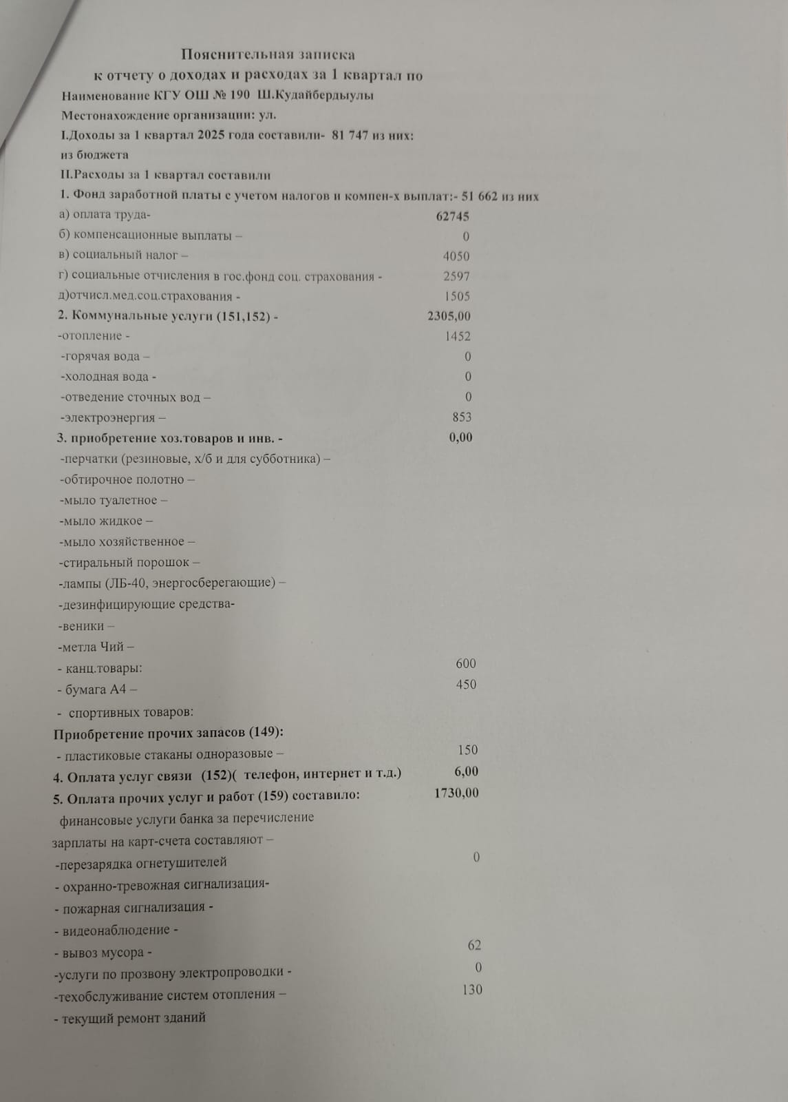 » 2025 жылғы 1 тоқсандағы кірістер мен шығыстар туралы