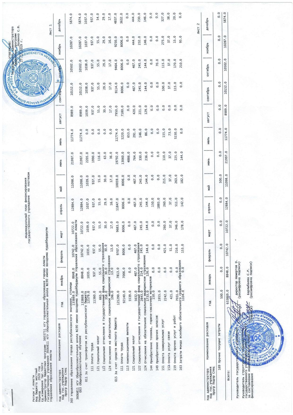 06 қаңтар 2020 0 1 2 3 4 5 Мемлекеттік мекеменің төлемдер бойынша жеке қаржыландыру жоспары 2020 жыл..............Индивидуальный план финансирования государственного учреждения по платежам 2020 год