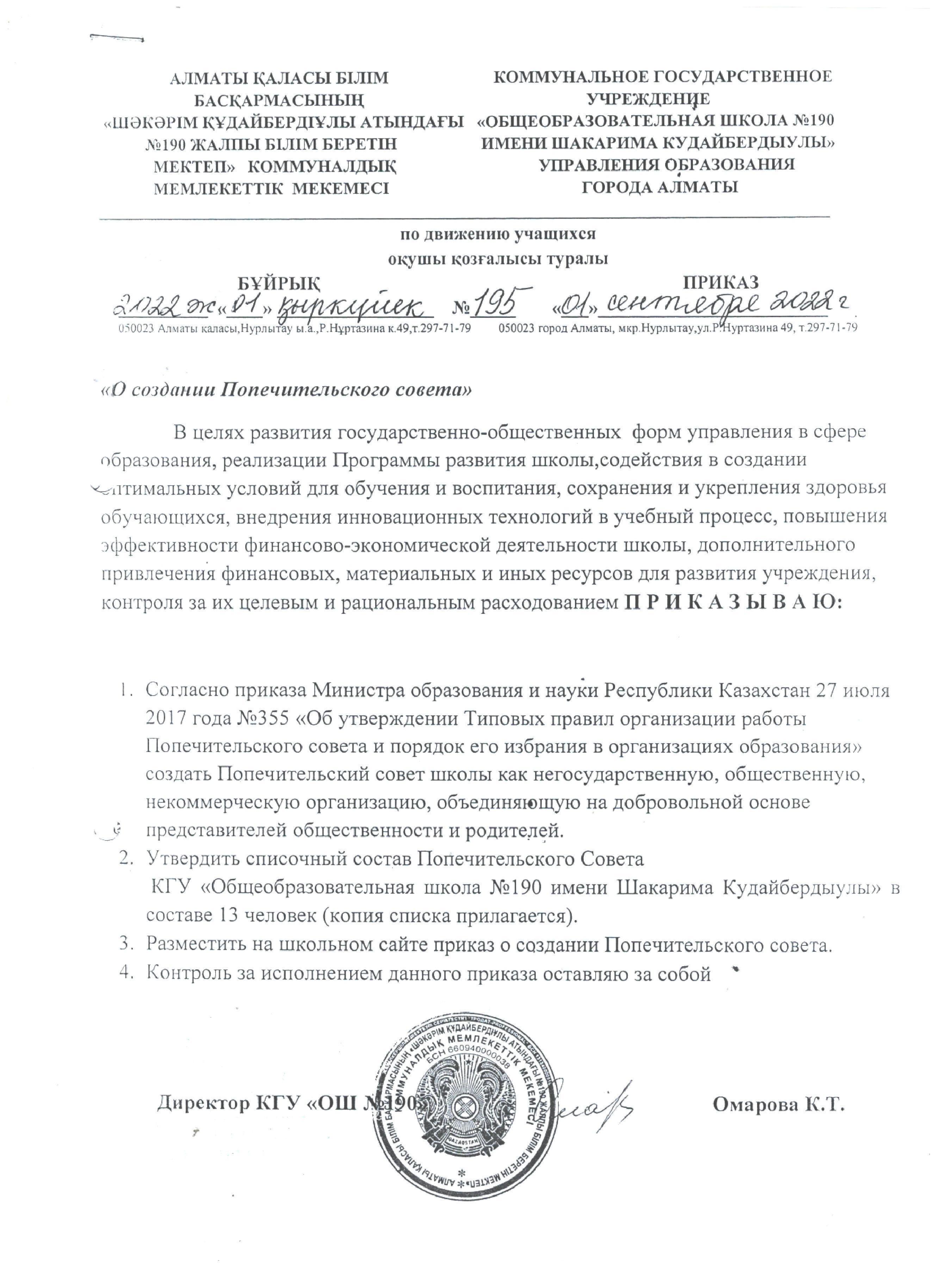 » Ш.Құдайбердіұлы атындағы №190 ЖББМ КММ Қамқоршылық кеңес 2022-2023 жыл