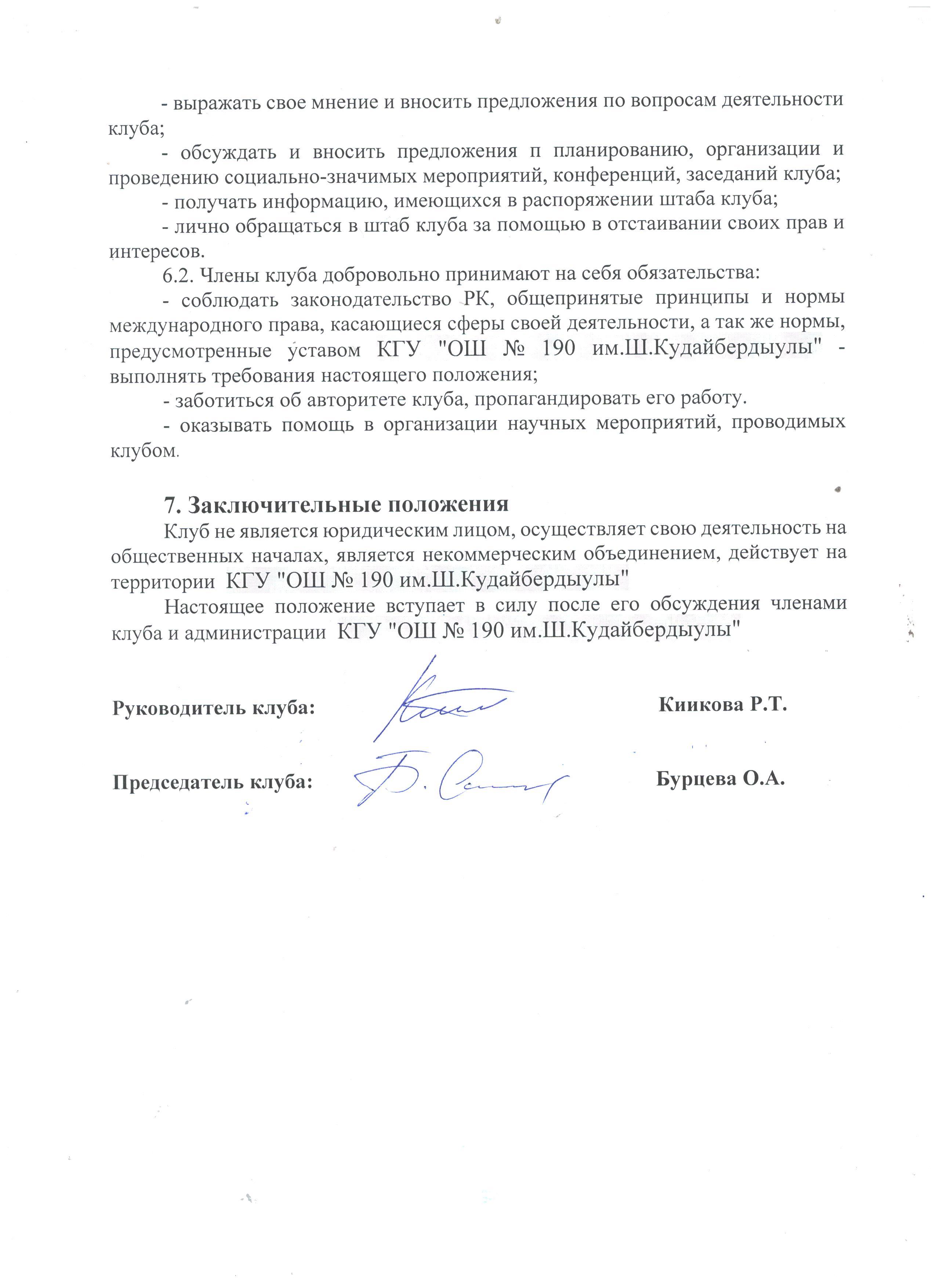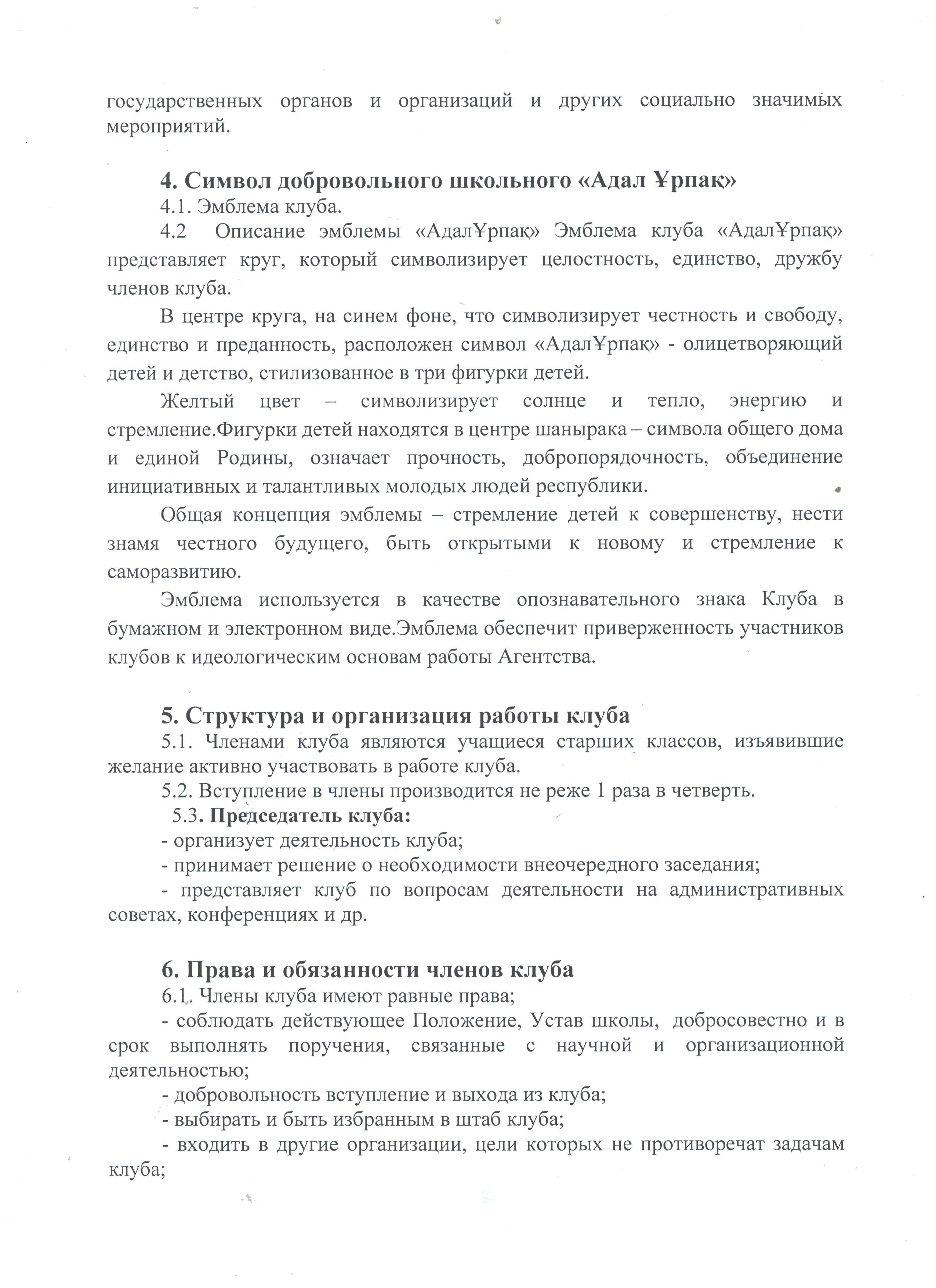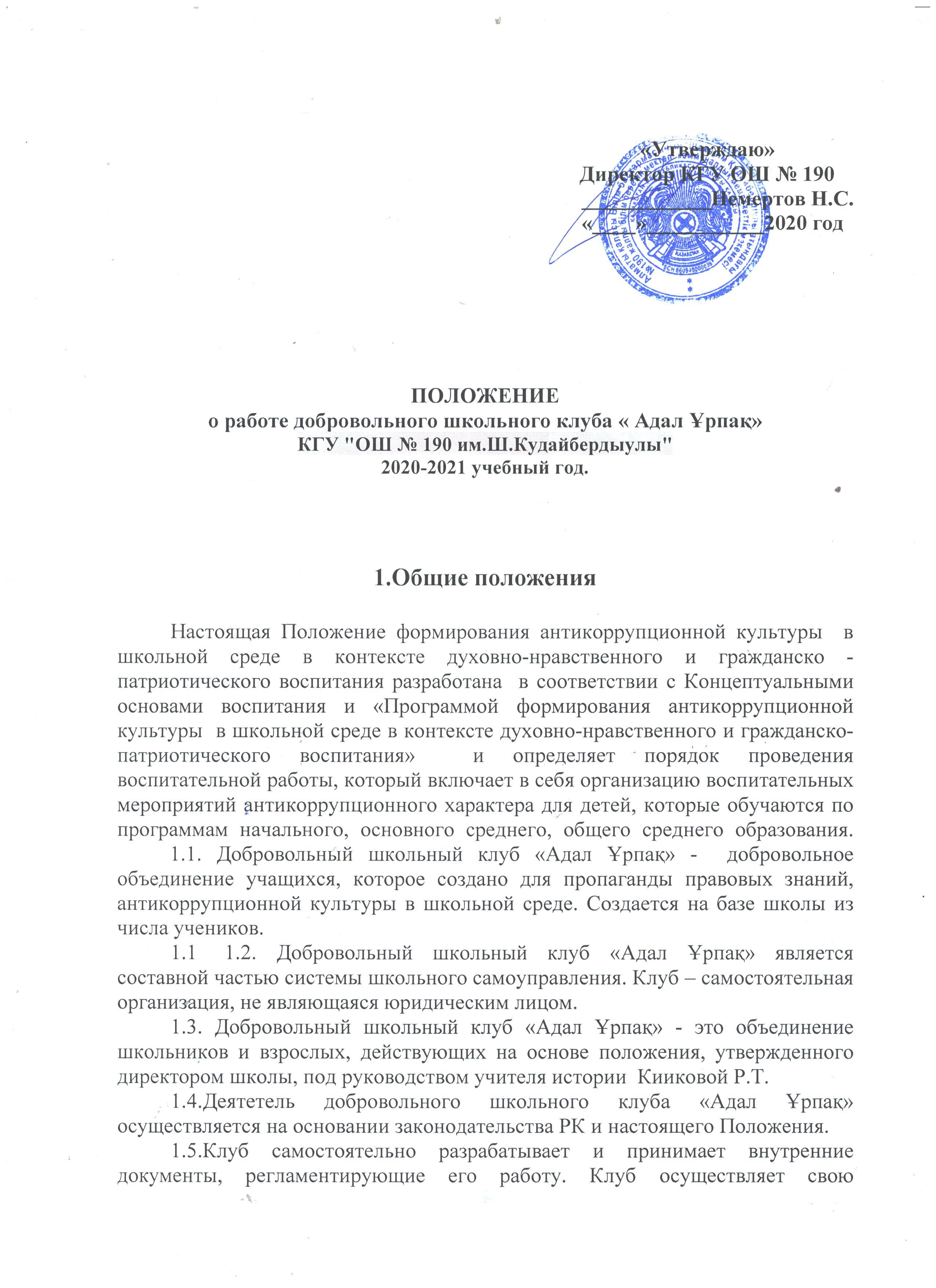 02 қыркүйек 2020 0 1 2 3 4 5 Положение о работе добровольного школьного клуба "Адал Ұрпақ" КГУ ОШ №190 им. Ш.Кудайбердыулы на 2020 - 2021 учебный год