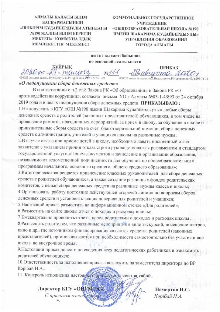 Приказ о создании добровольного школьного клуба "Адал Ұрпақ"