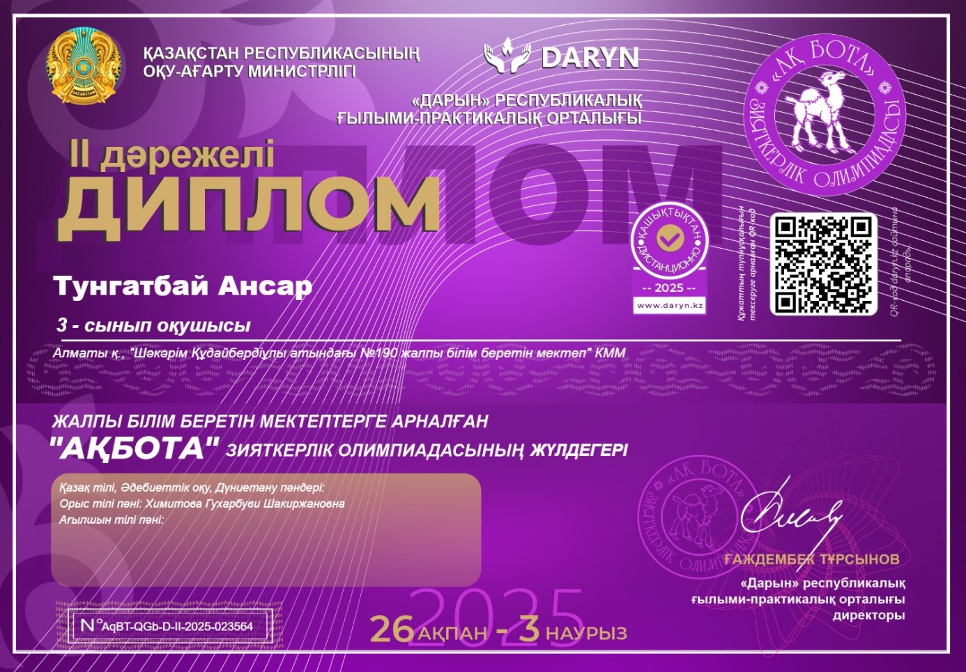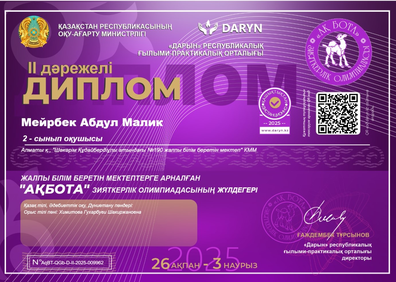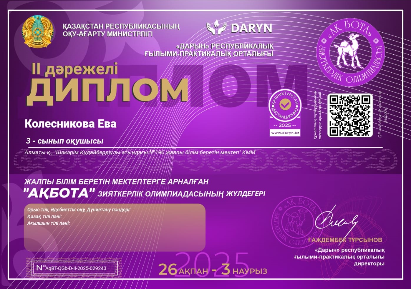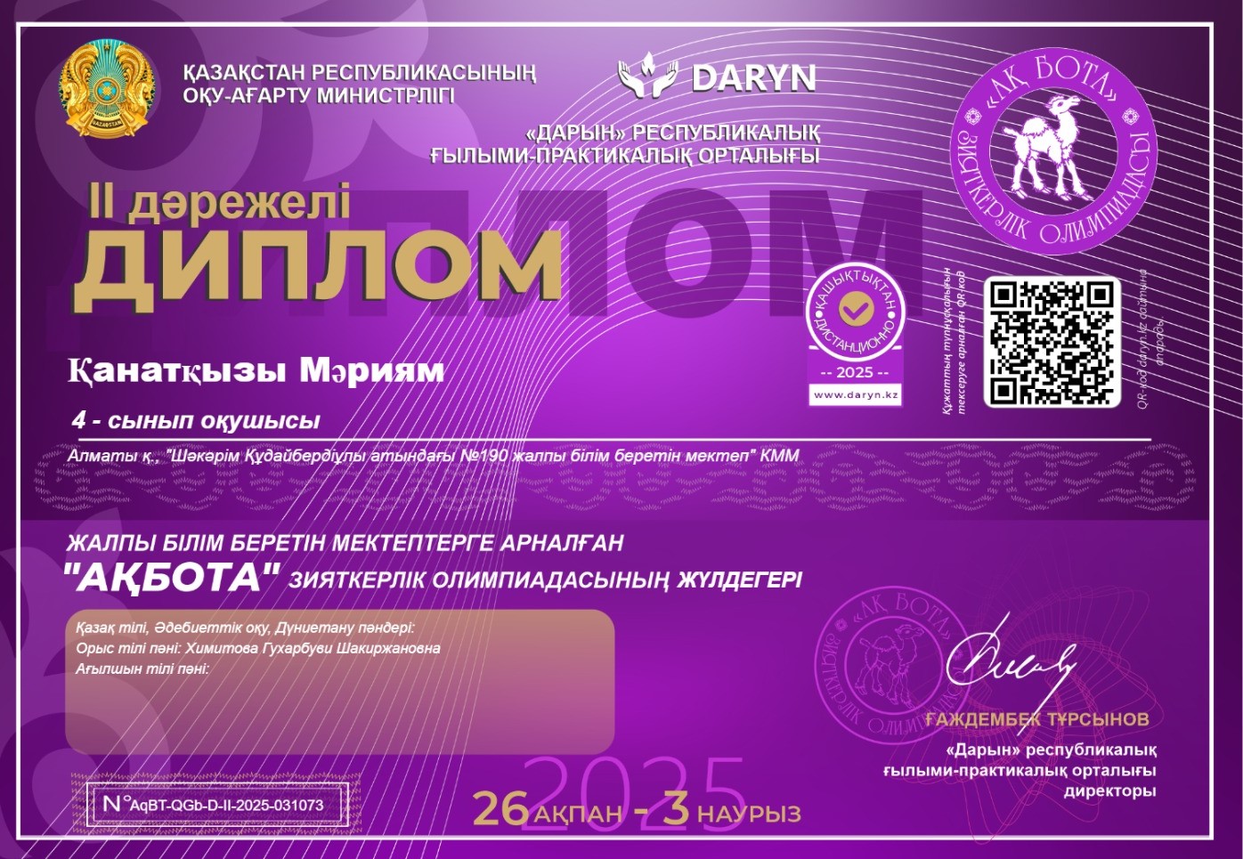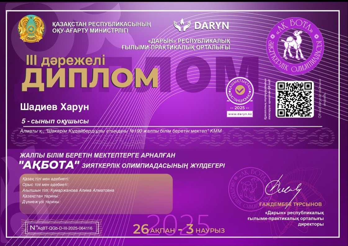 Республикалық "Математика-ғылымдар патшасы" Блиц-турнирінің 3-орын жеңілпазы "Ш.Құдайбердіұлы атындағы №190 ЖББМ" КММ математика-пәні мұғалімі Бекен Сандуғаш марапатталды.