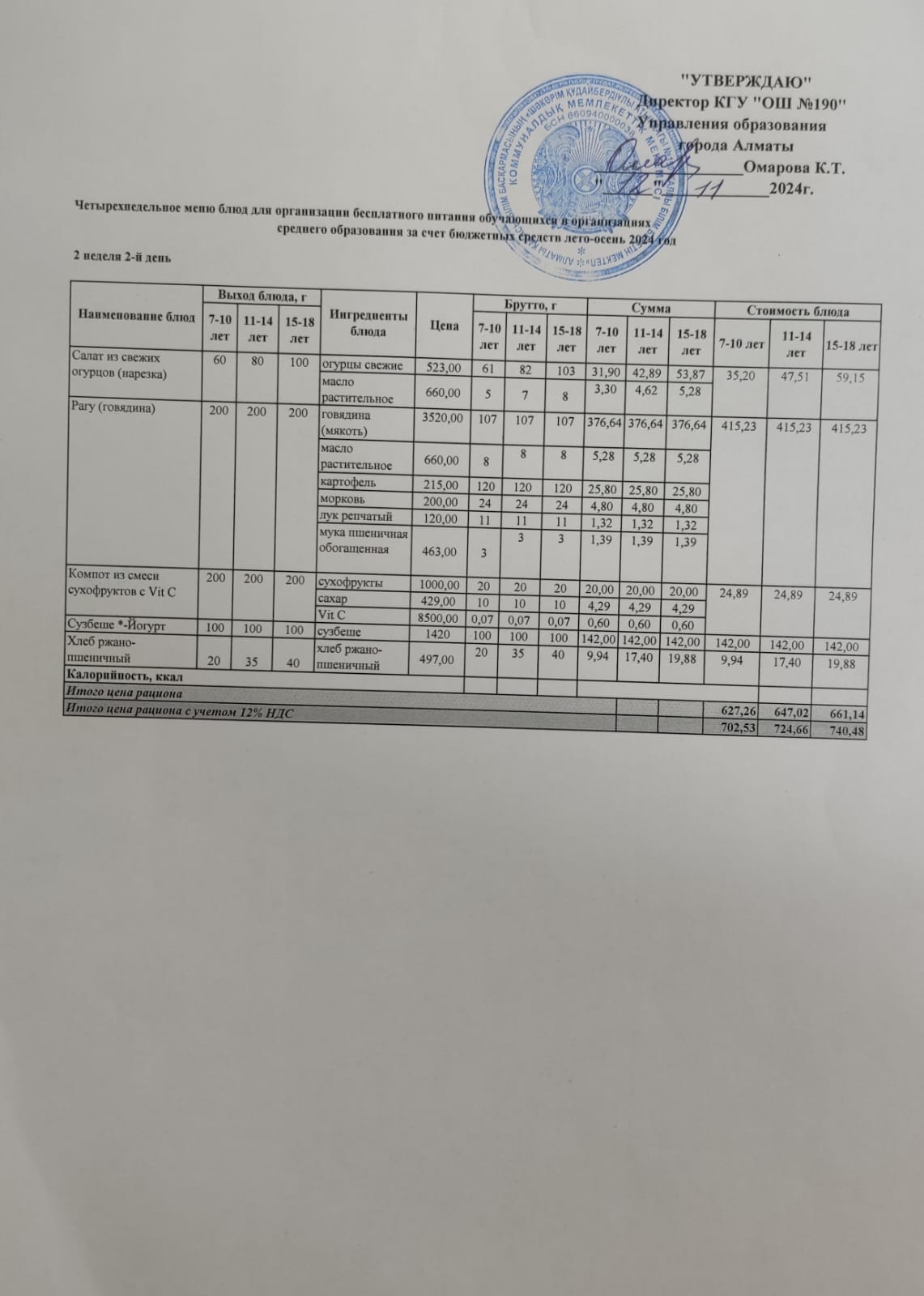2 апта 4 күн... Меню 2 неделя 4 день