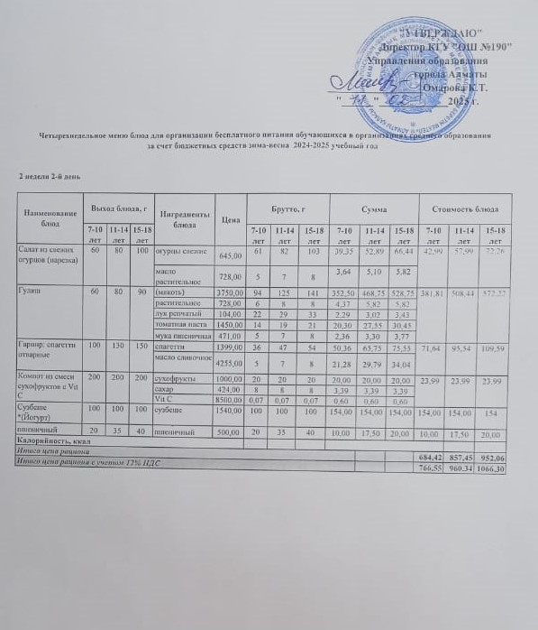 Меню 2 апта 1 күн