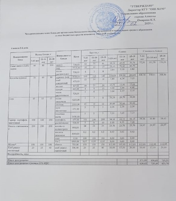Меню 1 апта 2 күн