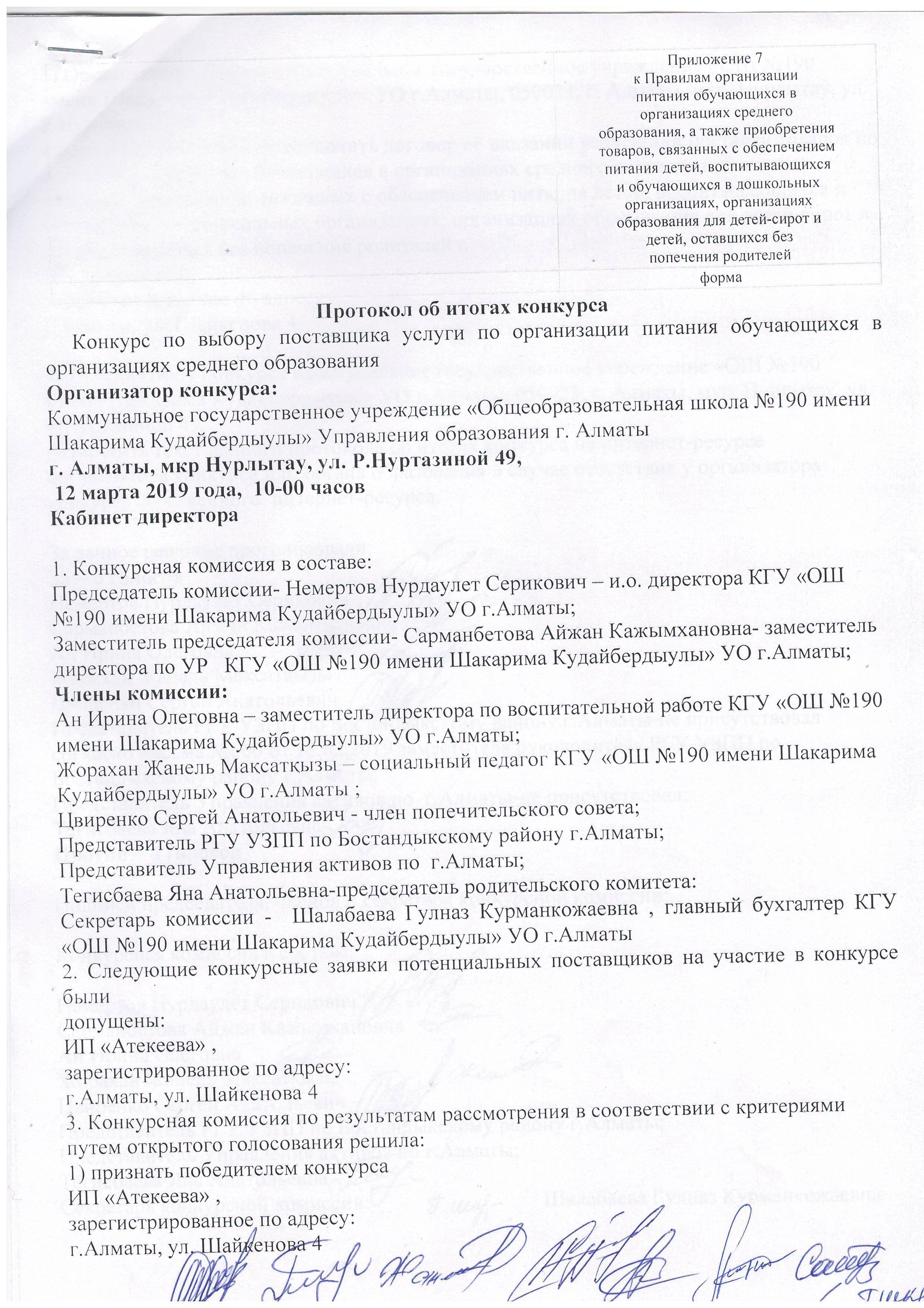 Протокол об итогах конкурса по организации питания: