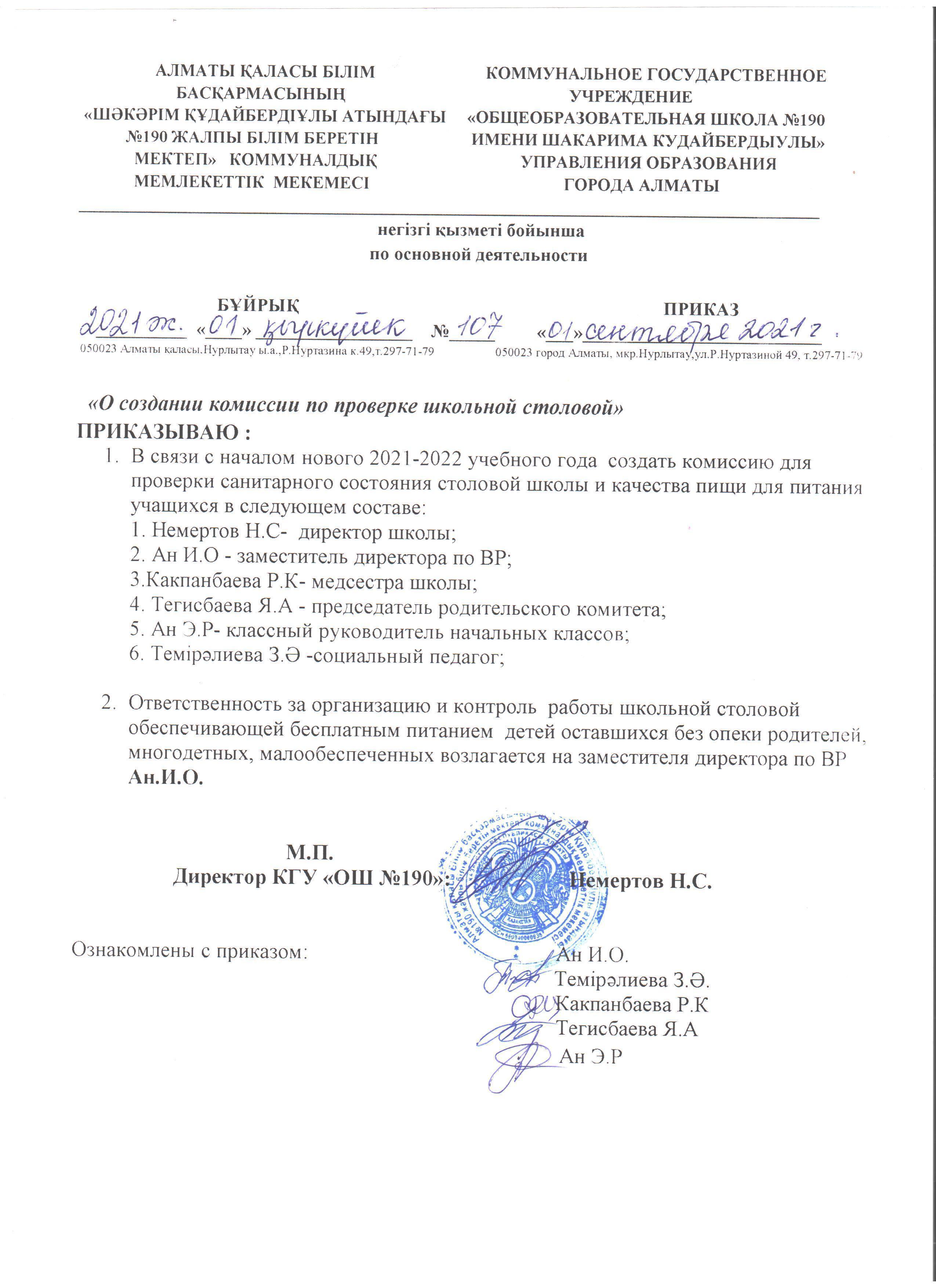 » Мектеп асханасын тексеру жөніндегі бұйрық 2021-2022ж