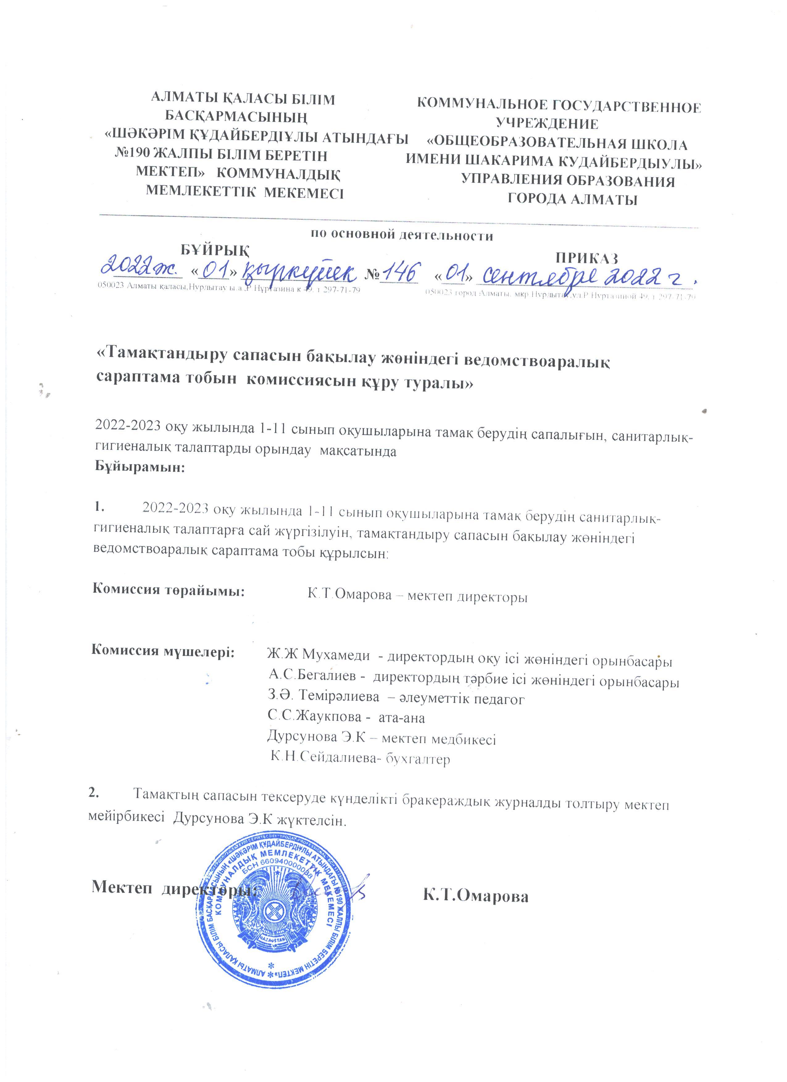 Тамақтандыру сапасын бақылау жөніндегі комиссиясын құру туралы бұйрық